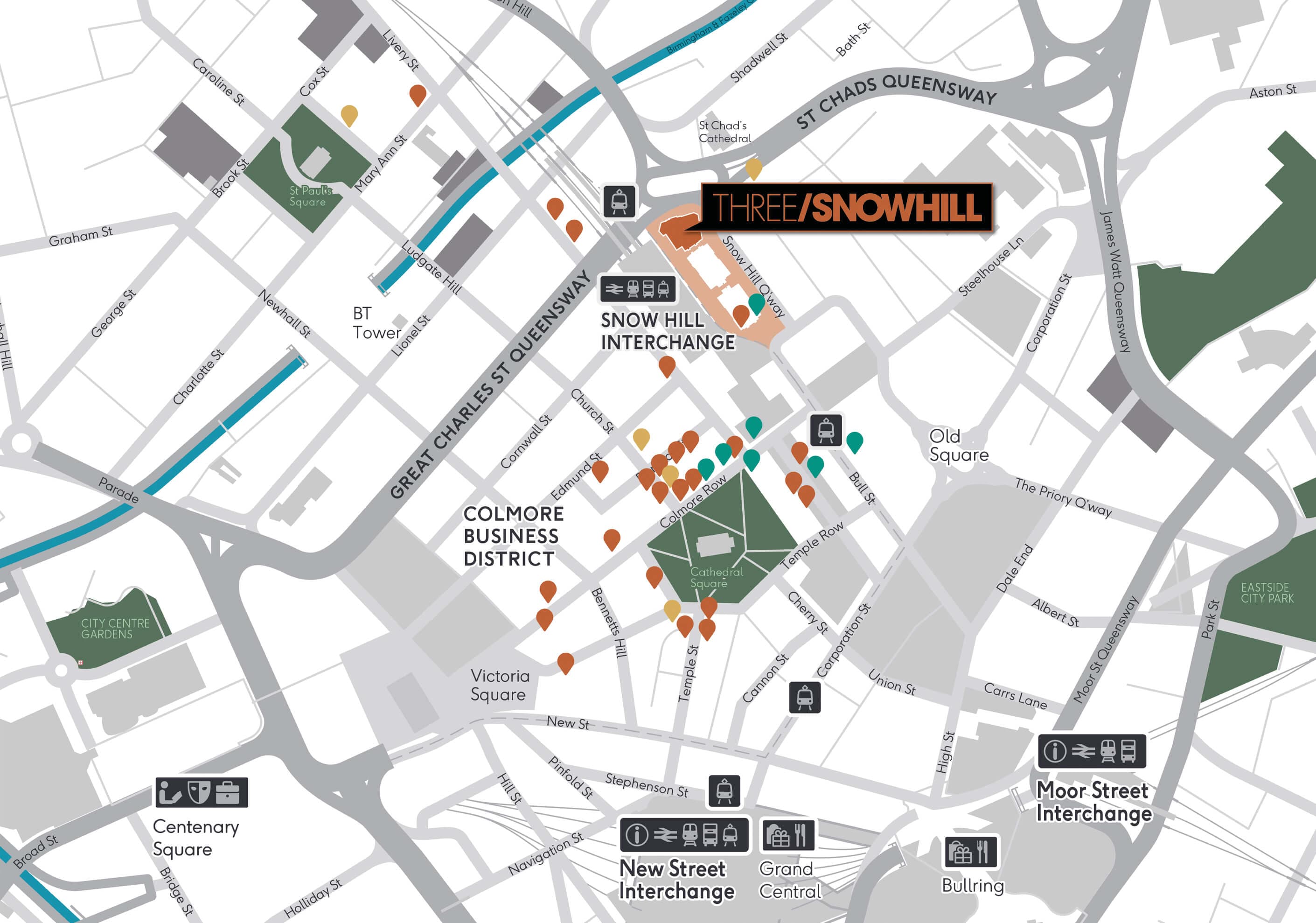 Independent bars and coffee shops, together with national brands, make for a lively leisure scene, all on the doorstep of Three Snowhill. The Grade II listed Grand Hotel, recently restored at a cost of £45m, is just around the corner.